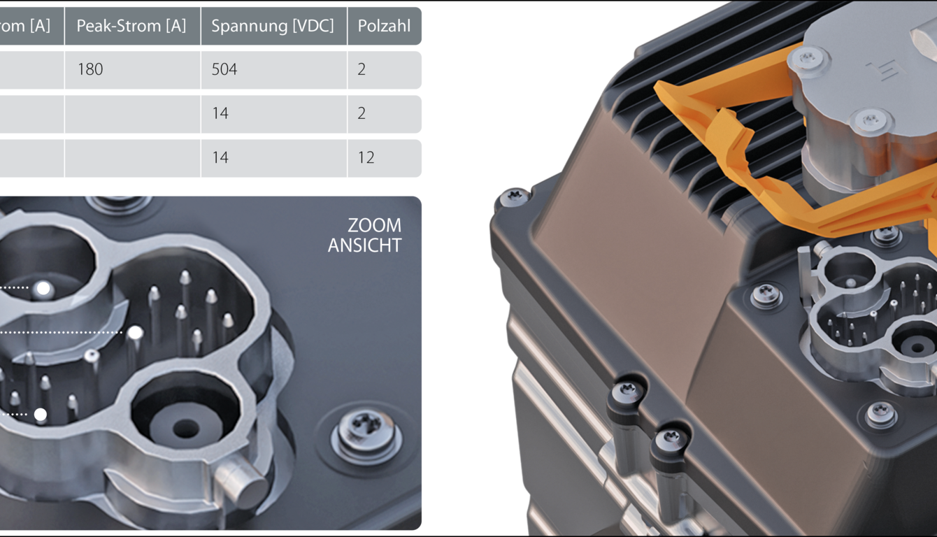 - Bemessungsstrom: 100 A (Power), 5 A (Signale)